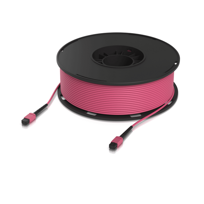 Indoor OM4 multi-mode fiber patch cable with MPO-12 Type B UPC connectors designed for 100G applications.